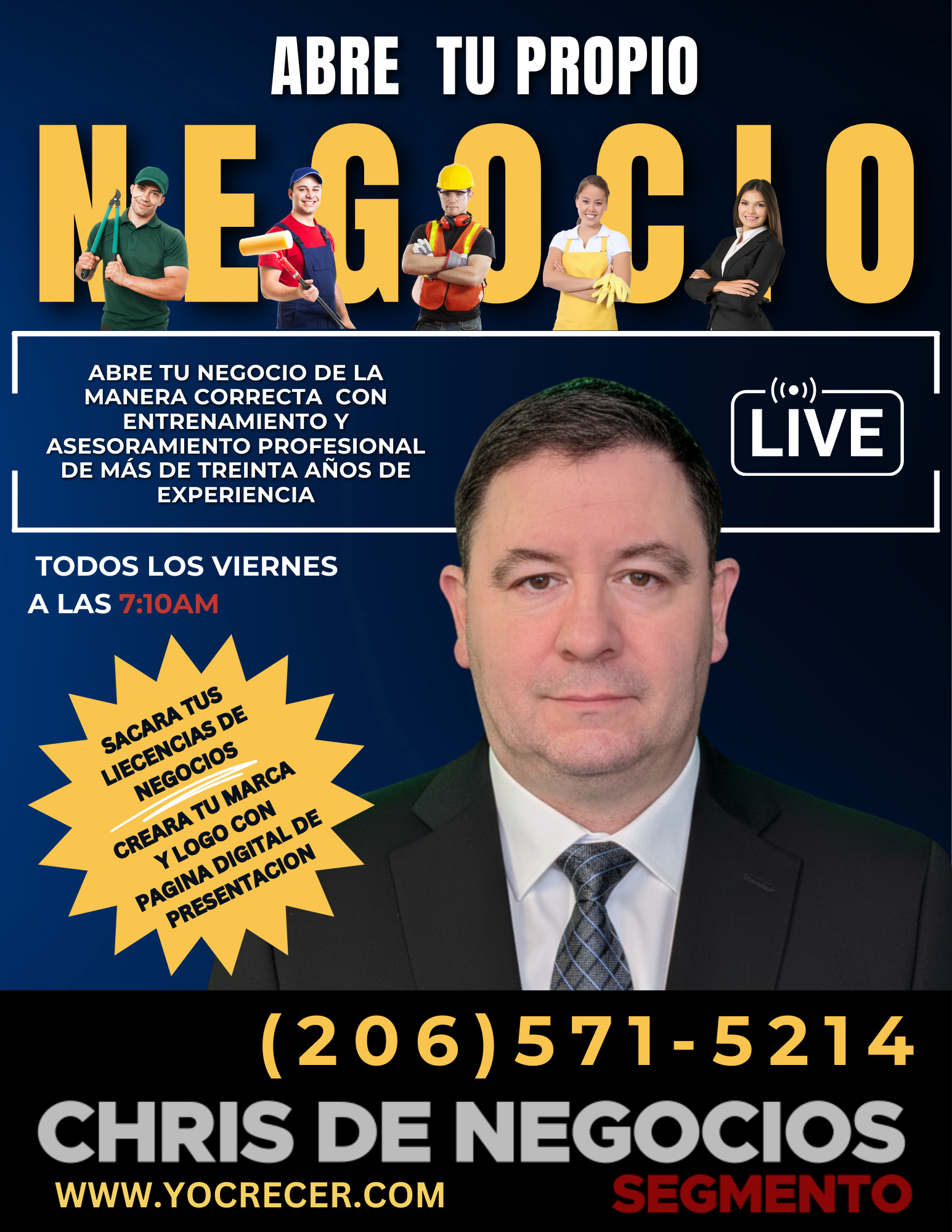 Con Mas De 17 Años en Radio Americana,14 Años En Radio Hispana Y 36 Años De Experiencia En Construir Compañías, Manejar Negocios Y Crear Marcas De Prestigio “Branding” Chris Está En Una Posición Muy Estratégica Para Guiar Tu Negocio A Que Finalmente Crezca Y No Te Quedes Esclavo De Él. Llámalo hoy al (206) 571-5214 y comienza a abrir posibilidades de finalmente hacer crecer tu negocio como debe ser. Con una base sólida y con la fortaleza de un sistema que puedes duplicar para poder expandir tu visión y transformarla en una compañía multigeneracional. Pregúntate: Si es cierto que menos del 1% de negocios realmente expanden y crecen, como pretendo yo ser parte de eses grupo, si no tengo las herramientas para hacerlo?